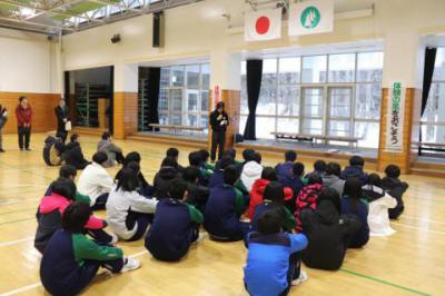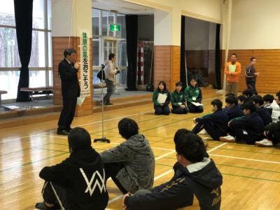 昨年度から始まった大樹高校とのスキー交流事業が今年度も開催されました。1/29(水)、大樹高校の生徒達が国立日高青少年自然の家に到着後、本校生徒との対面式が行われました。各校それぞれの代表生徒から挨拶があった後、翌日のスキー交流の班毎に自己紹介を兼ねて交流が行われました。